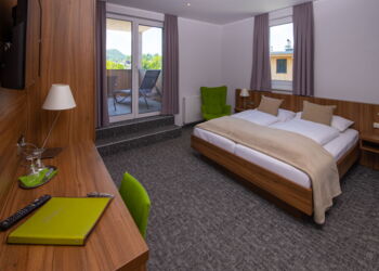 Grandioser Blick vom Doppelzimmer auf den Traunsee und die umliegenden Berge im Salzkammergut, Oberösterreich. Kuscheliges Doppelzimmer mit Top-Ausstattung. Mit Teppichboden und überdachter Terrasse.
